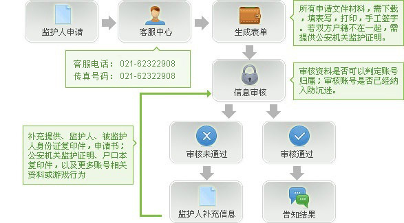 家长监护系统充分考虑家长的实际需求,当家长发现自己的孩子玩游戏过于沉迷的时候,由家长提供合法的监护人资质证明、游戏名称账号、以及家长对于限制强度的愿望等信息,可对处于孩子游戏沉迷状态的账号采取几种限制措施,解决未成年人沉迷网游的不良现象,如限制孩子每天玩游戏的时间区间和长度,也可以限制只有周末才可以游戏,或者完全禁止。